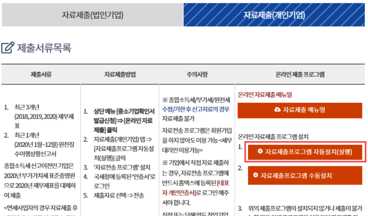 4)자료제출을 위해 객인기업인지 법인기업인지 확인 후 자료제출프로그램 자동설치(실행)을 클릭하기