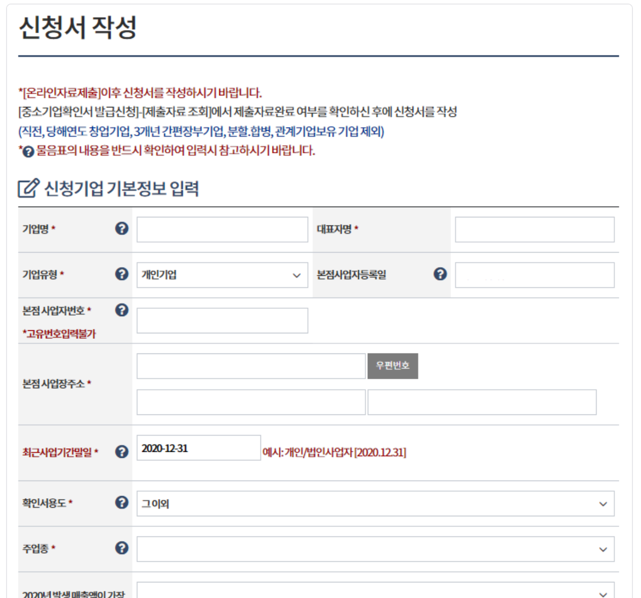 7)신규 이용자 등록 완료 후 로그인 이후 온라인 자료 제출 및 기본정도 입력 (상호명, 대표자명, 사업장 소재지)