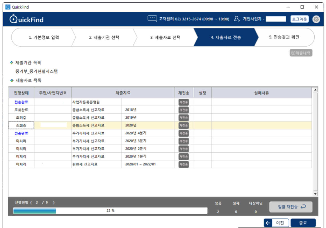 9)제출자료 전송(소요시간 10분)이 되며 완료가 되면 종료버튼을 클릭