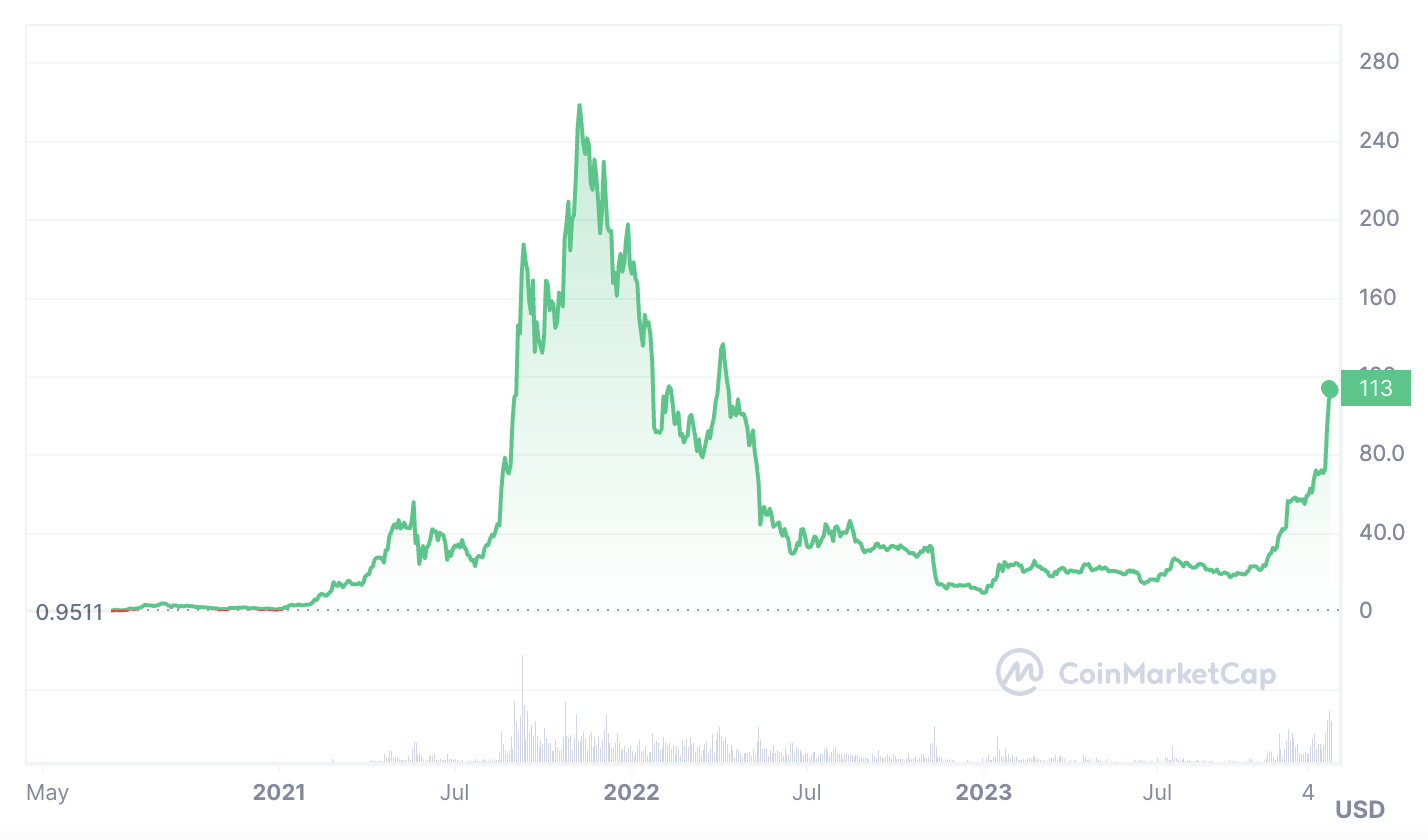 모두의 관심이 사라지고 23년 연초 30만원을 넘던 솔라나는 9,300원까지 떨어집니다. FTX 사태로 코인가격은 떨어졌지만 당시 솔라나의 생태계 그리고 빠른 속도 (물론 처리량문제로 중단되는 일도 잦았습니다.)는 여전했습니다. 즉 내부적인 이유로 떨어진 것이 아니라 외부의 이슈로 떨어진 것이죠.