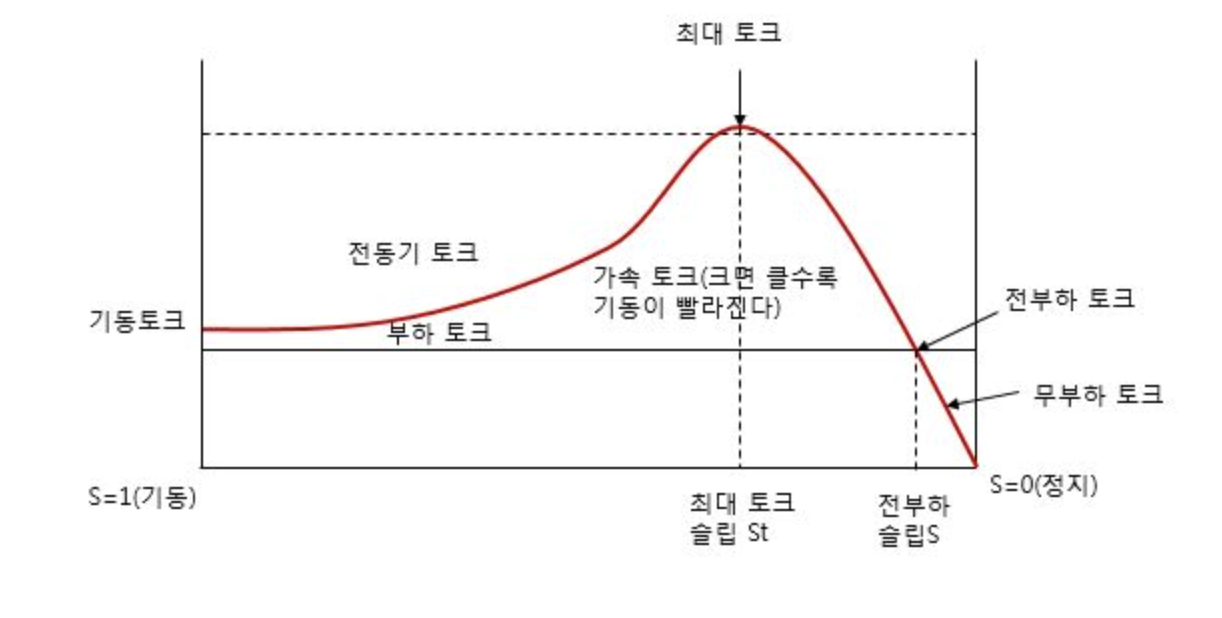 전동기용 유도기에서는 특히 **기동구간(슬립 1 → 0.1 부근)**과 **정격운전구간(슬립 0.02 근방)**이 중요하다. 기동 시 슬립이 매우 크기 때문에 토크-슬립 곡선이 급격히 증가하는 구간을 지나게 된다. 이때 부하가 큰 설비라면 기동토크가 충분히 크지 않으면 전동기는 아예 회転을 시작하지 못하고 정지한 채로 과전류만 발생시키게 되므로, 앞서 배운 기동 방식 선택이 중요한 이유가 여기에 있다. 반면 정상 운전 시에는 슬립이 매우 작은 영역에서 운전되는데, 이 구간은 토크가 슬립에 거의 비례하여 변화하는 선형 영영으로, 부하가 약간 변하여도 전동기가 크게 흔들리지 않고 안정적으로 운전된다. 이것이 유도전동기가 산업 현장에서 ‘기계적 안정성’을 가진다고 평가받는 이유다.